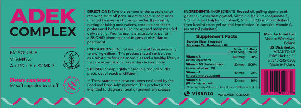 ADEK Complex of Fat-Soluble Vitamins: A + D3 + E +K2 MK-7