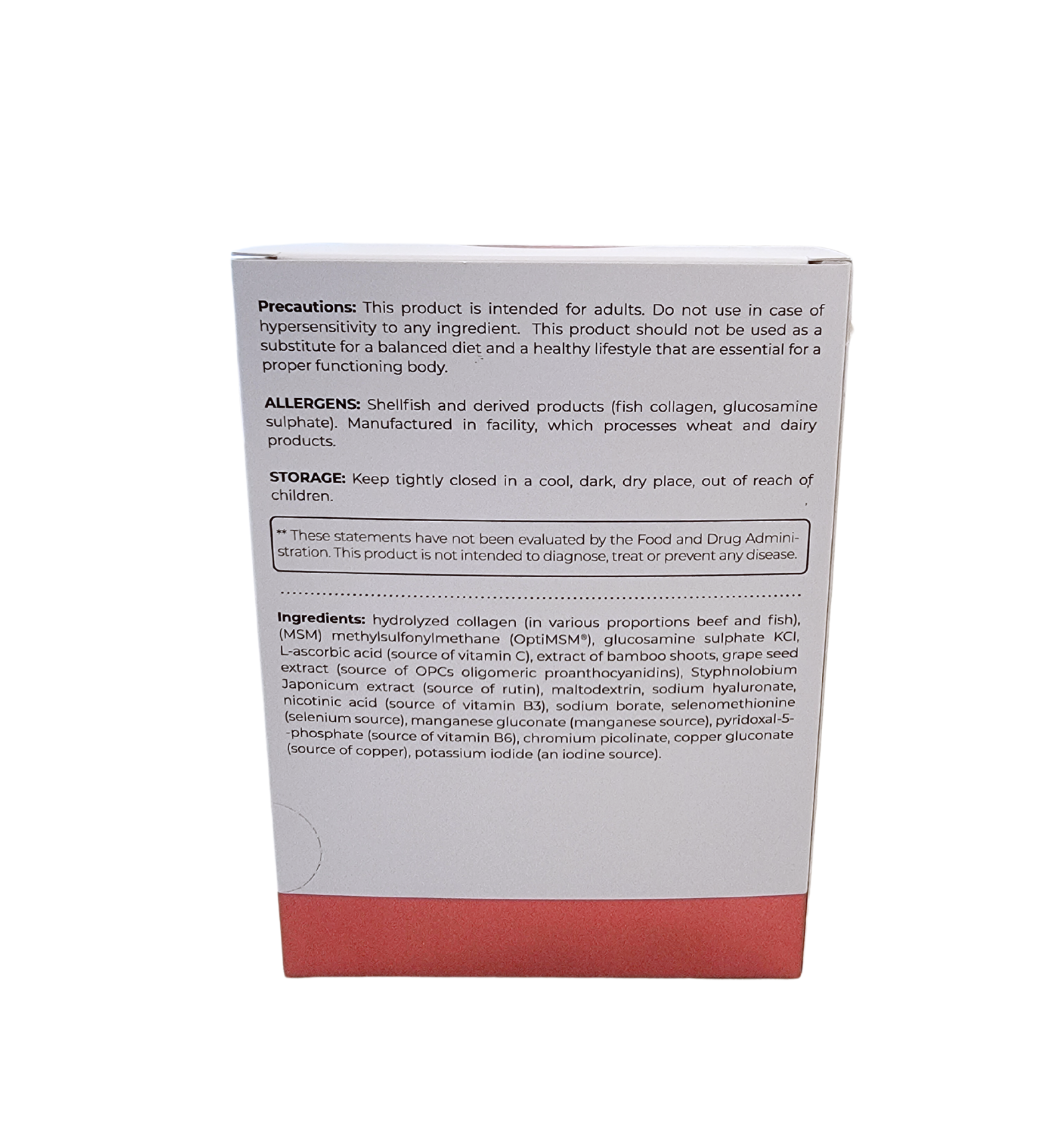 INGREDIENTS: hydrolyzed collagen (in various proportions beef and fish), methylsulfonylmethane (MSM), glucosamine sulphate KCI, L-ascorbic acid (source of vitamin C), extract of bamboo shoots, grape seed extract (source of OPCs oligomeric proanthocyanidins), Styphnolobium Japonicum extract (source of rutin), maltodextrin, sodium hyaluronate, nicotinic acid (source of vitamin B3), sodium borate, selenomethionine (selenium source), manganese gluconate (manganese source), pyridoxal-5-phosphate (source of vitamin B6), chromium picolinate, copper gluconate (source of copper), potassium iodide (an iodine source).
