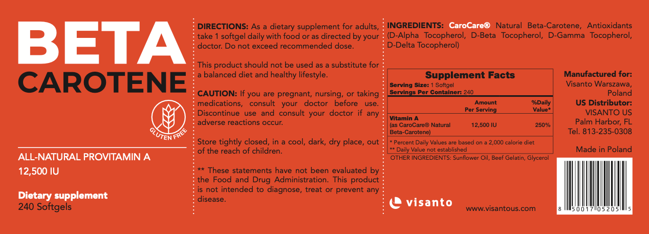 INGREDIENTS: CaroCare® natural beta carotene, sunflower oil, gelatin, humectant (glycerol) and antioxidant (a mixture of tocopherols D-alpha-tocopherol, D-beta-tocopherol, D-gamma-tocopherol, D- delta-tocopherol).