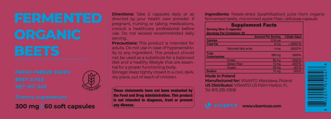 INGREDIENTS: Fermented Organic Beets (as Freeze-Dried Juice), micronized Apple Fiber, Cellulose Capsule.