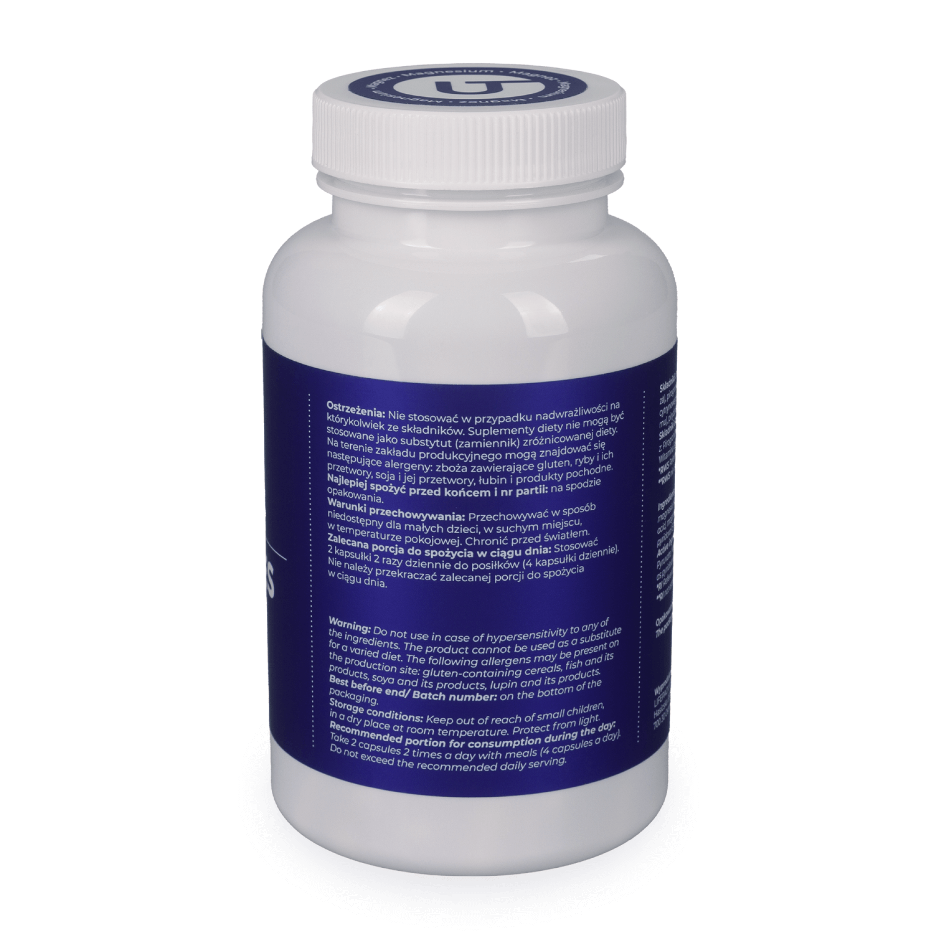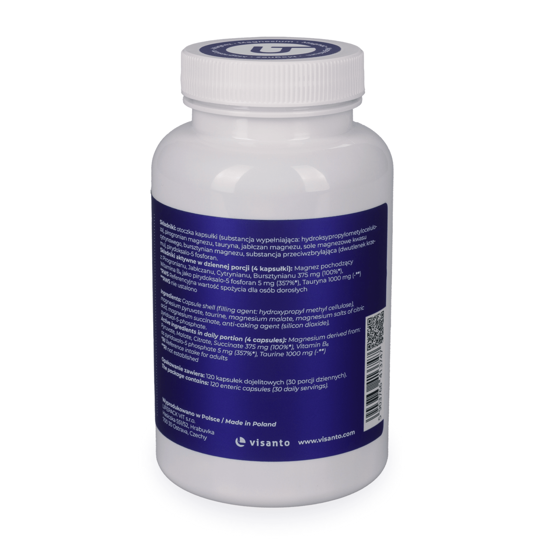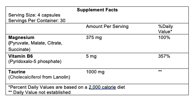 INGREDIENTS: Capsule shell (filling agent: hydroxypropyl methyl cellulose), magnesium pyruvate, taurine, magnesium malate, magnesium salts of citric acid, magnesium succinate, anti-caking agent (silicon dioxide), pyridoxal-5-phosphate.
