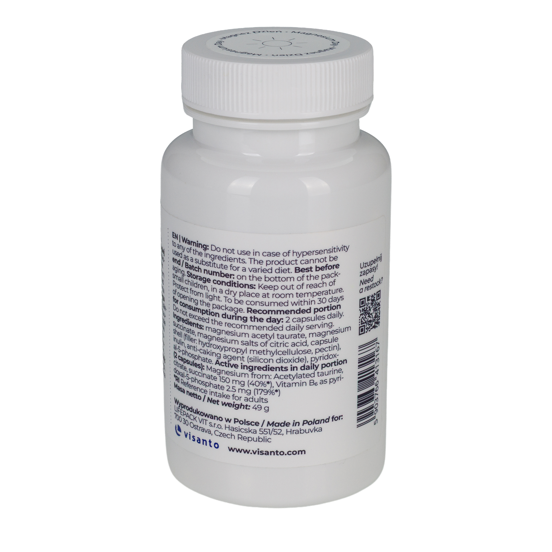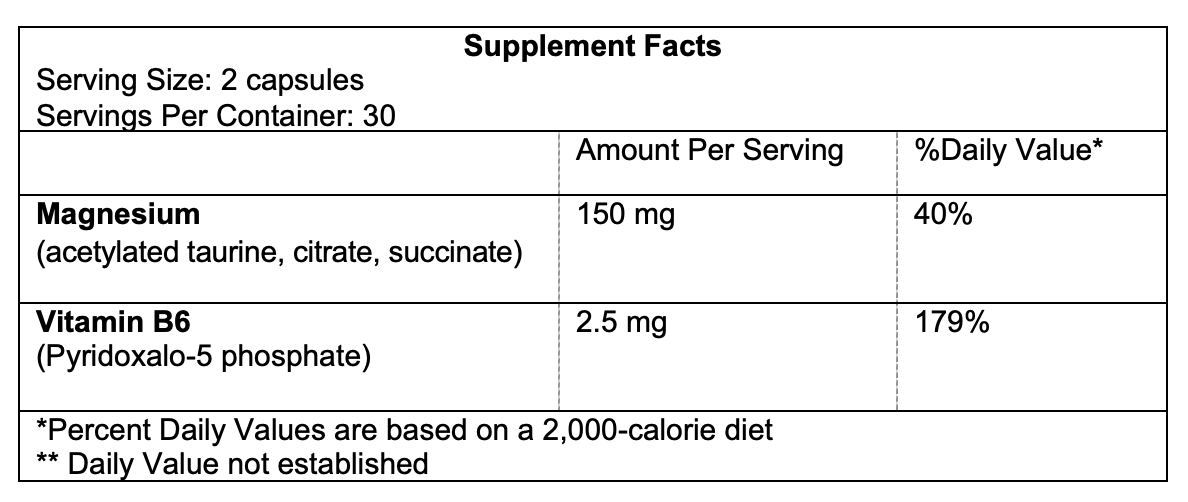 INGREDIENTS: Capsule shell (filling agent: hydroxypropyl methyl cellulose), magnesium taurine, magnesium salts of citric acid, magnesium succinate, anti-caking agent (silicon dioxide), pyridoxal-5-phosphate.