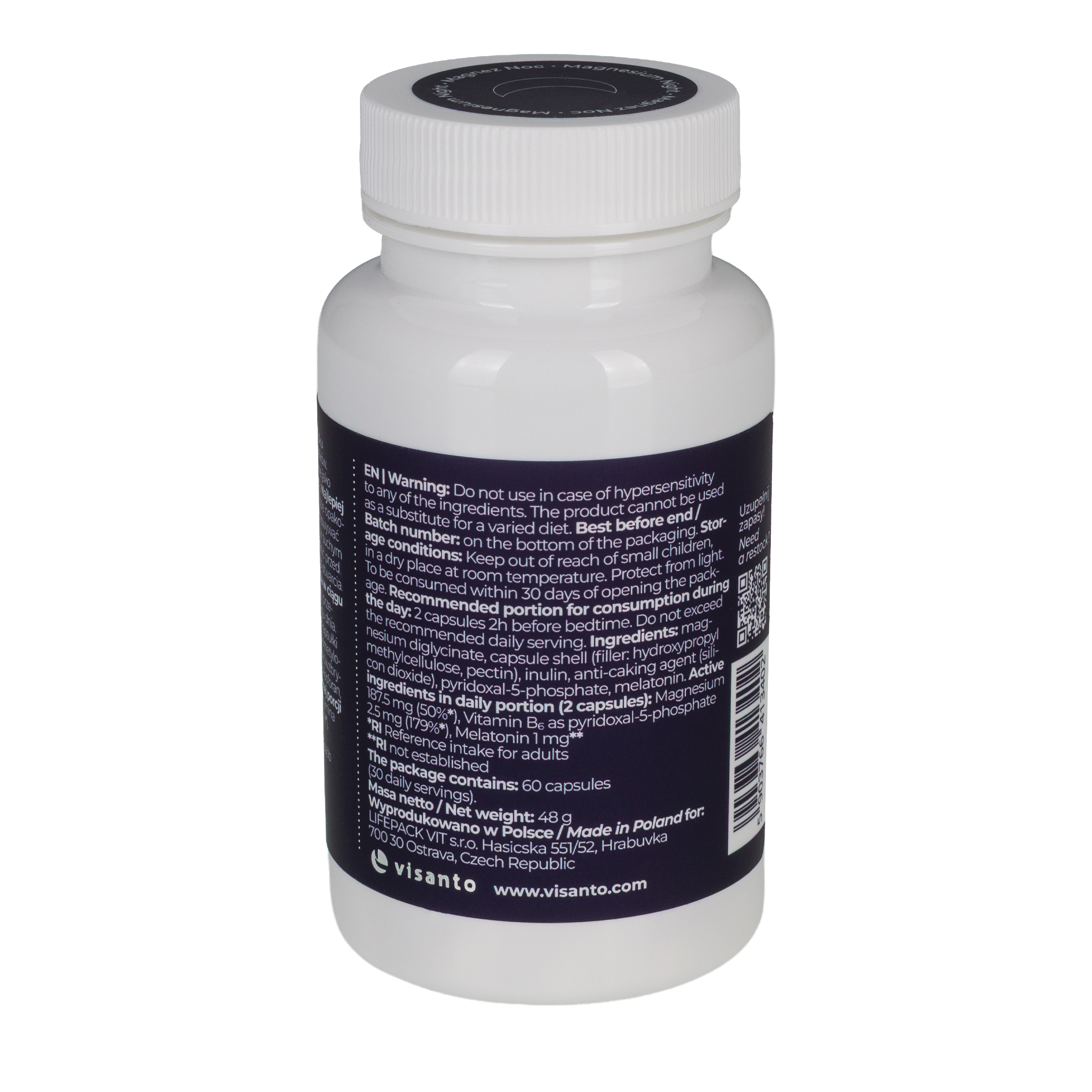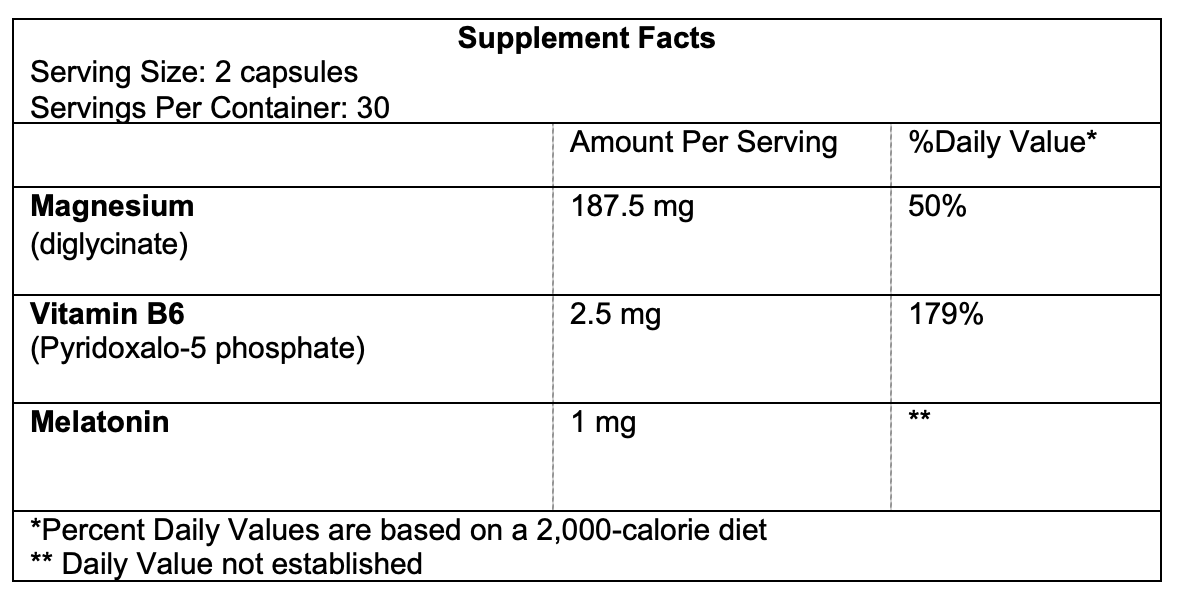 INGREDIENTS: Capsule shell (filling agent: hydroxypropyl methyl cellulose), inulin, magnesium diglycinate, anti-caking agent (silicon dioxide), pyridoxal-5-phosphate, melatonin.