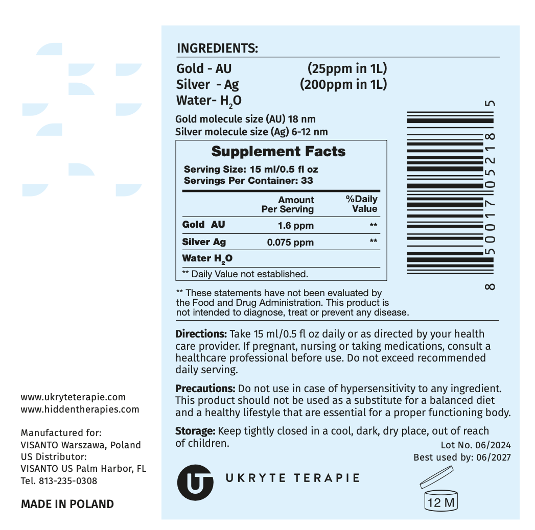 INGREDIENTS: Gold - AU (25ppm in 1L), Silver - Ag (200ppm in 1L), Water- H2O, Gold molecule size (AU) 18 nm, Silver molecule size (Ag) 6-12 nm.