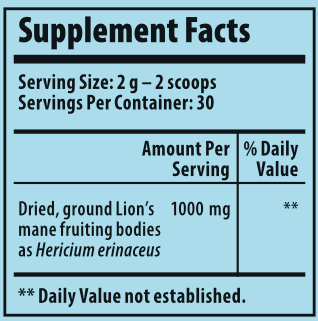 INGREDIENTS: 100% dried ground lion’s mane fruiting bodies (Hericium erinaceus). The product contains naturally accruing sulfur dioxide and sulfates in medicinal mushroom extracts.