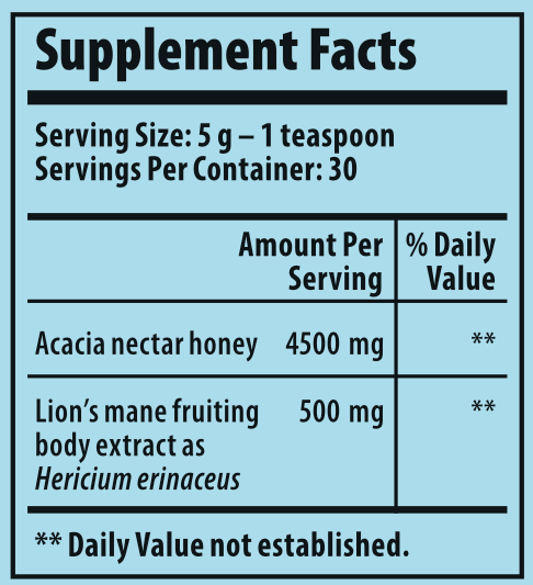 INGREDIENTS: Acacia nectar honey, extract from lion’s mane fruiting bodies (Hericium erinaceus). The product contains naturally accruing sulfur dioxide and sulfates in medicinal mushroom extracts.