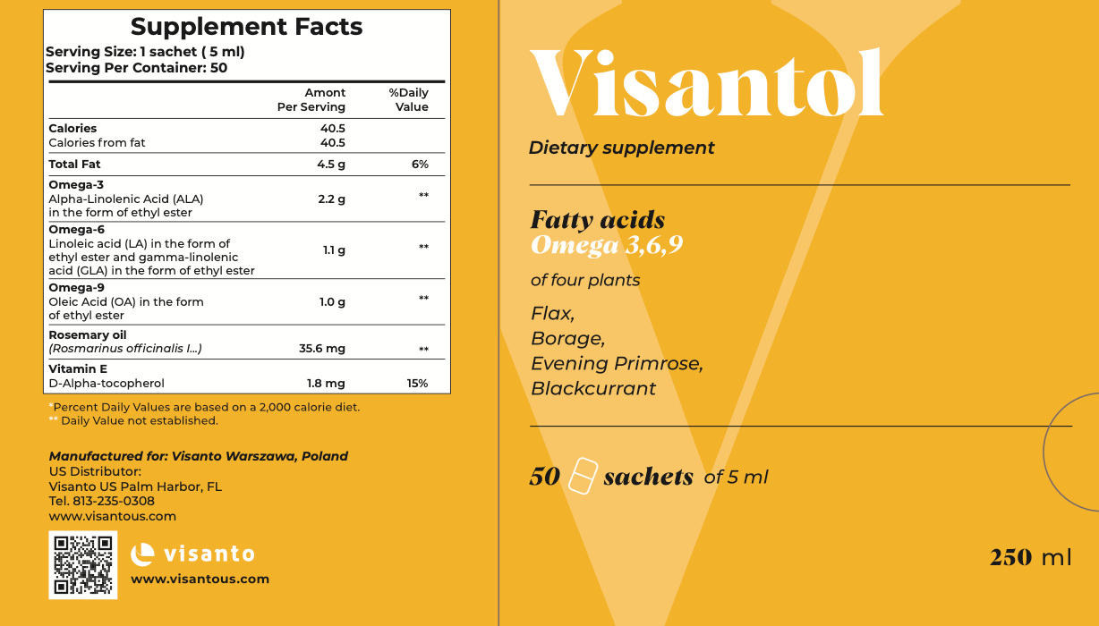 VISANTOL contains esters of essential unsaturated fatty acids (EUFA) Omega 3, 6, 9 in a liquid form, isolated from cold pressed herbal oils (linen, borage seed, evening primrose, blackcurrant, rosemary oil), vitamin E.